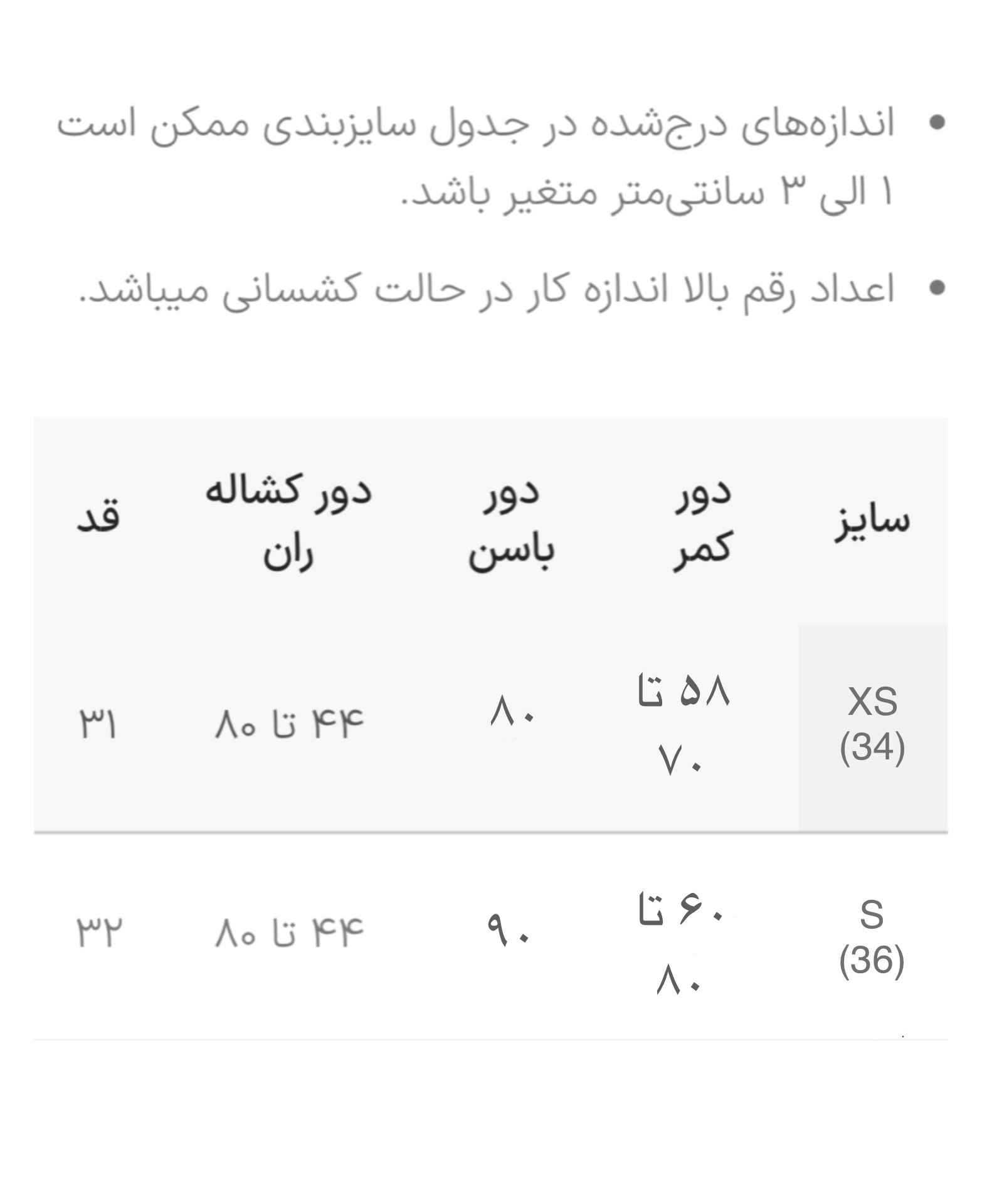 جدول سایز در اسلاید آخر