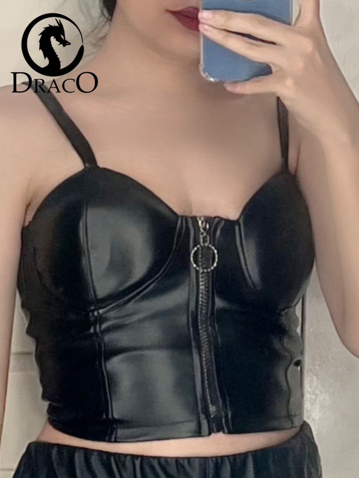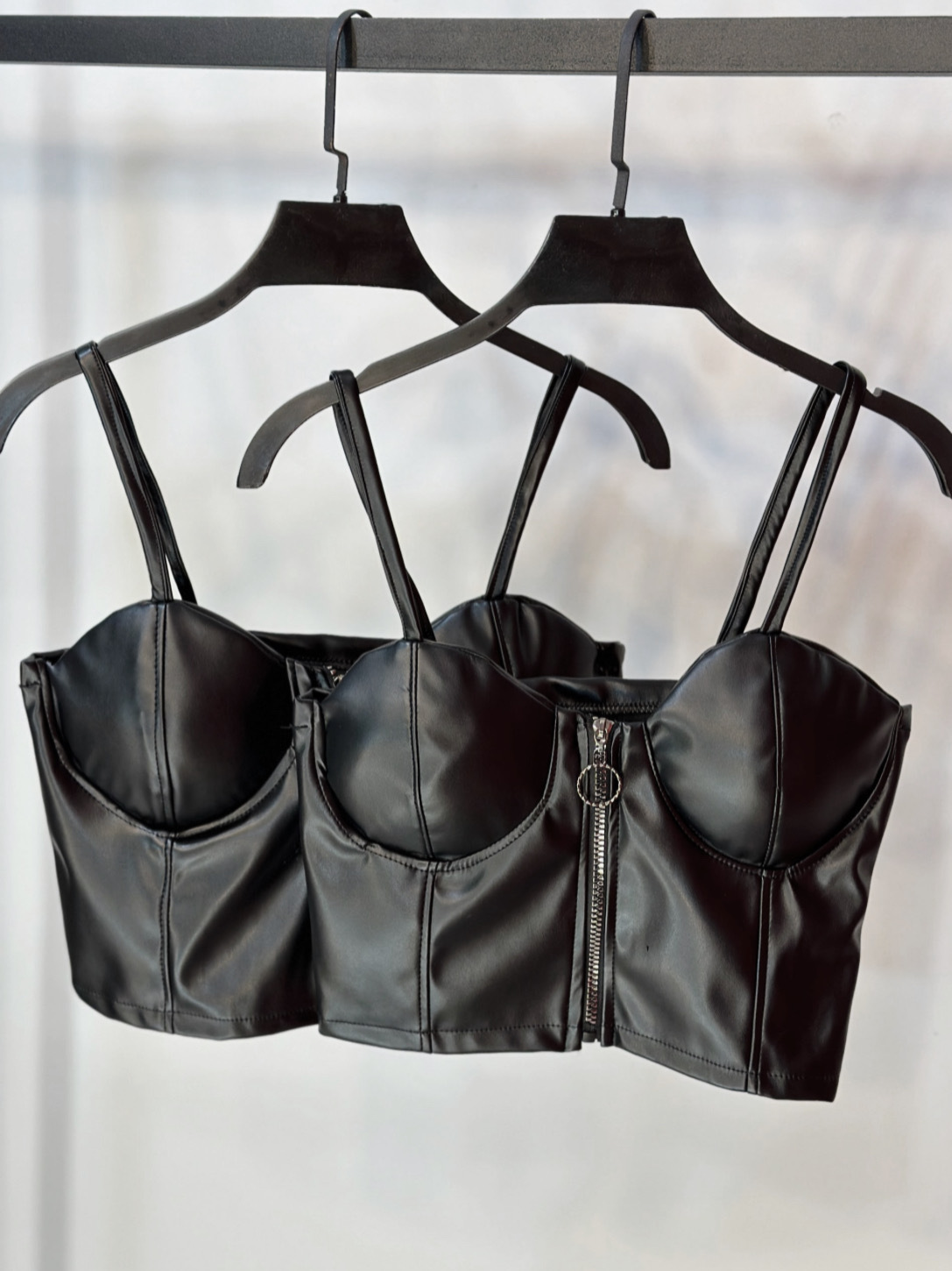 محصول جدیدمون یک کراپ تاپ بندیِ چرم مشکی هست که کاپ داره و باعث میشه قسمت سینه خوش فرم تر دیده بشه و جلوی لباس زیپ داره و پوشیدن و باز و بسته کردنش رو راحت تر میکنه.