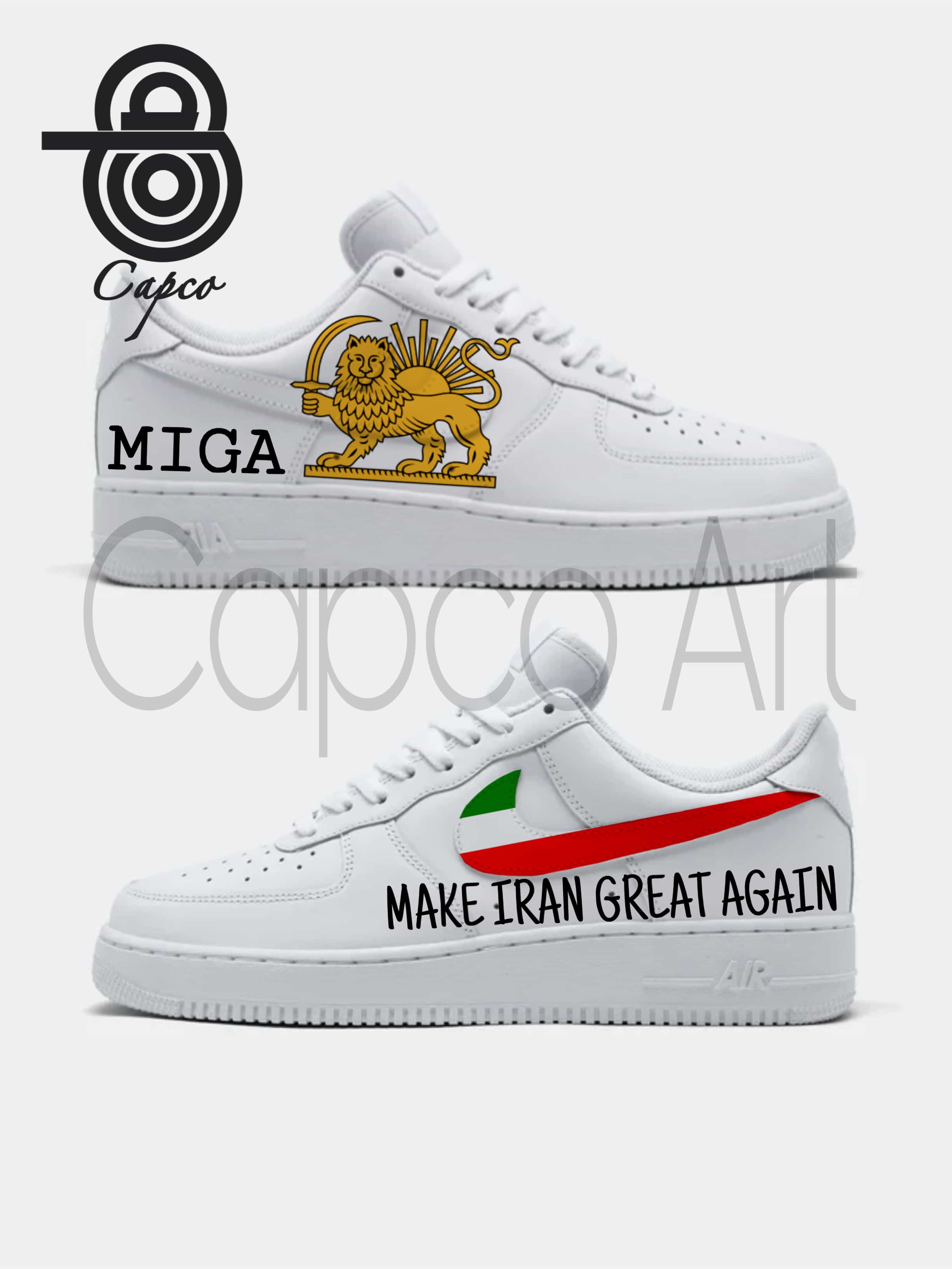 کفش نایکی ایرفورس (Air Force 1) با طرح نقشه ایران و نماد شیر و خورشید با نوشته ی MIGA (MAKE IRAN GREAT AGAIN) ❤️