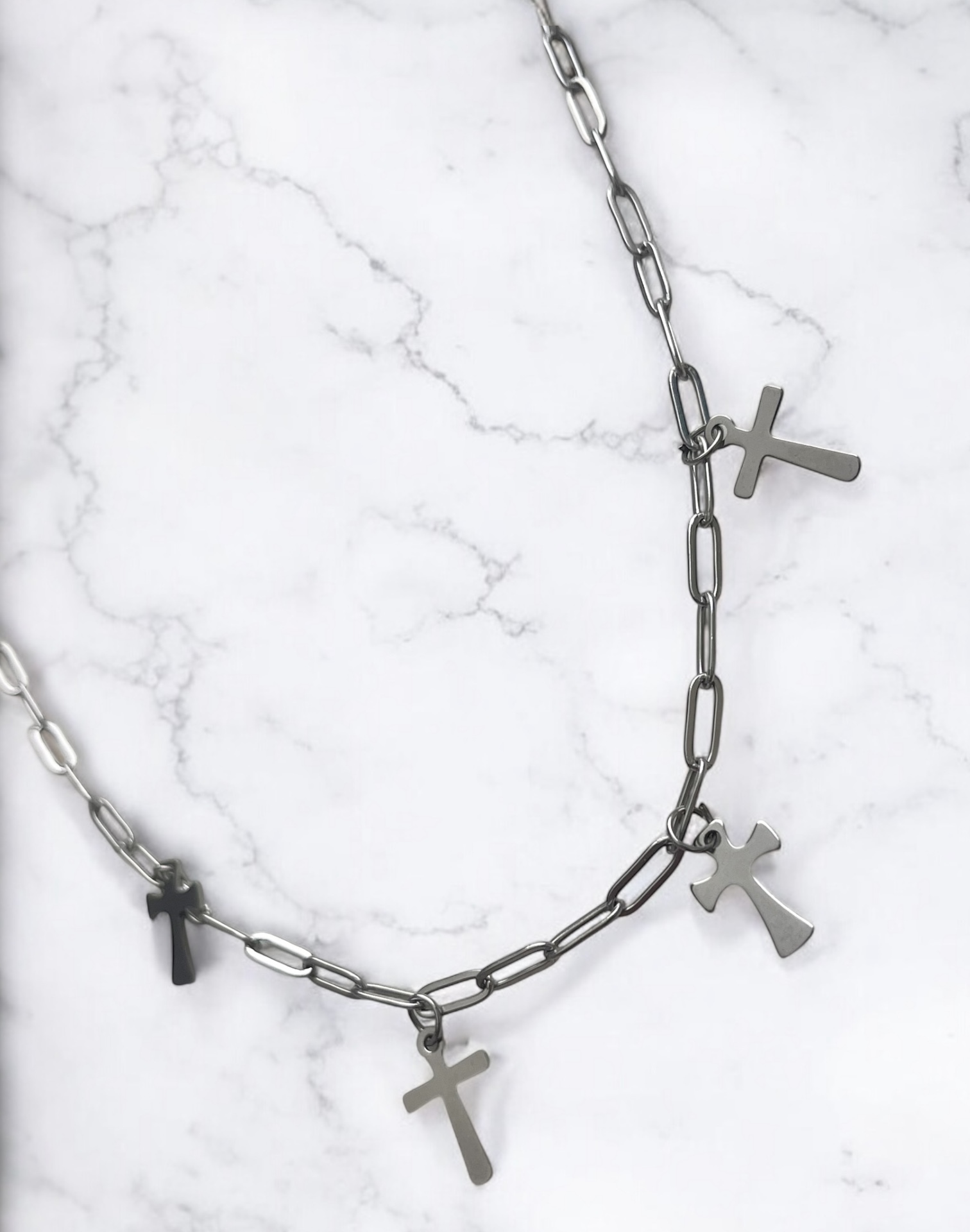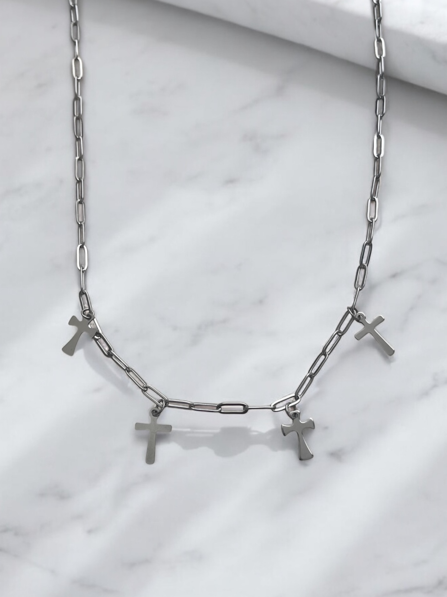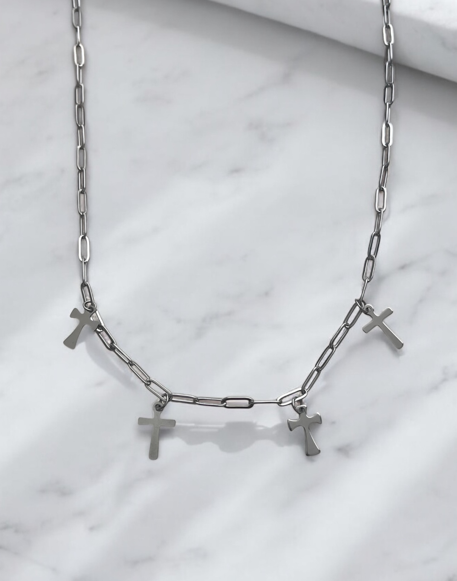این گردنبند طراحی اختصاصی دراکو هست با زنجیر بیضی شکل که خیلی خاص و منحصر به فرد هست با چهار پلاک صلیب کوچیک که دو مدل و بصورت یکی در میون قرار داده شدند.